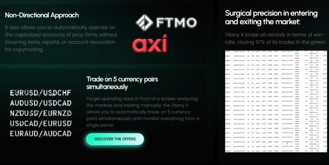 Titany AXI Pro MT4 is the revolutionary automated trading solution developed by championship trader Tommaso Nardini, featuring patented “X Technology” that has closed over 12,500 trades with a 97% win rate. Unlike dangerous Martingale systems, this expert advisor uses intelligent Anti-Martingale risk management to protect your capital while maximizing profits across 5 currency pairs simultaneously (EURUSD, GBPUSD, AUDUSD, NZDUSD, EURGBP, and more).